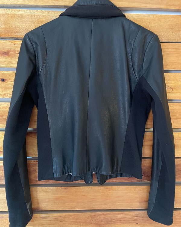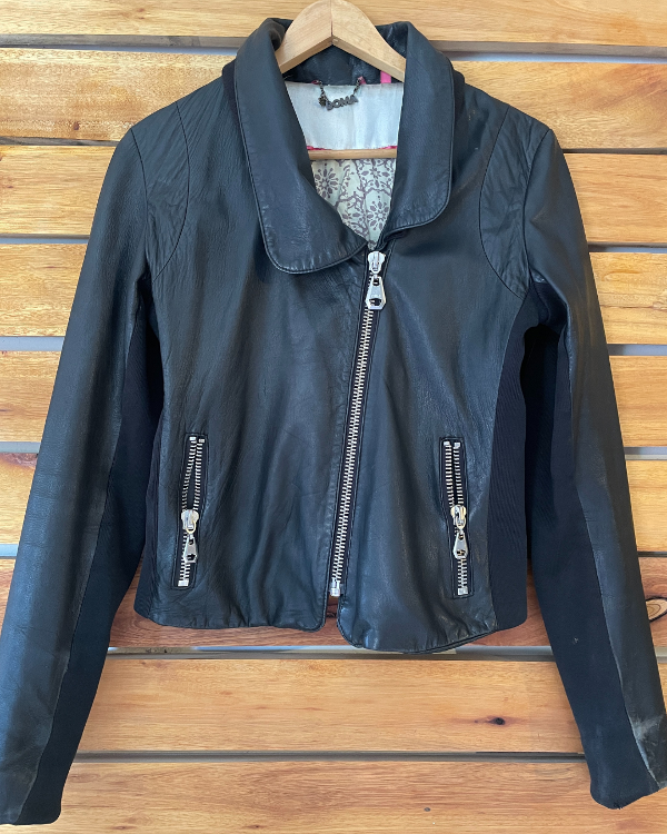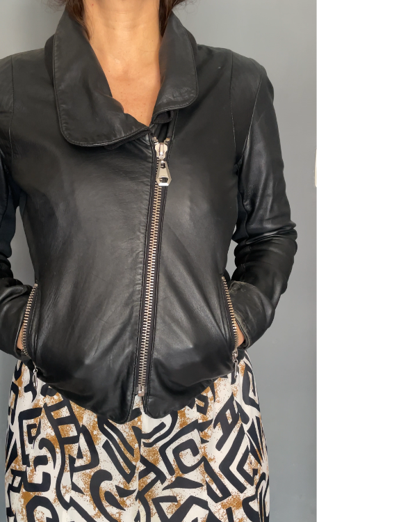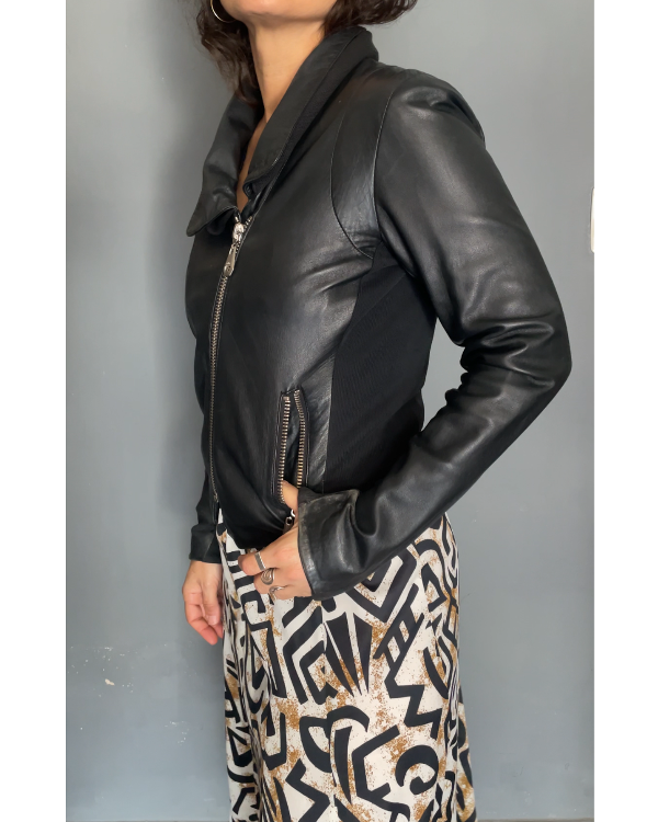 Cierre en diagonal con cuello doble, en cuero y algodón.