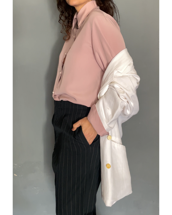 Cruzado, diseño de hombros anchos con hombreras finas y entallado levemente en la cintura.