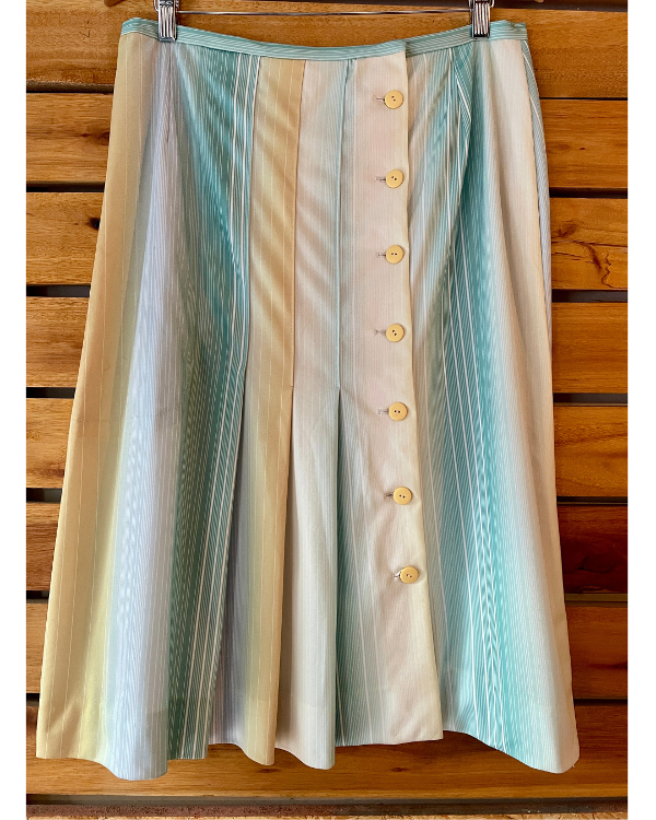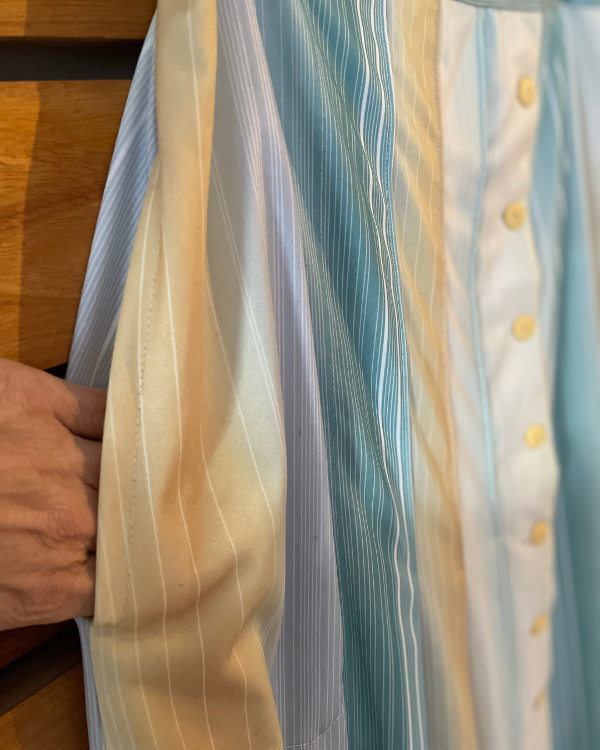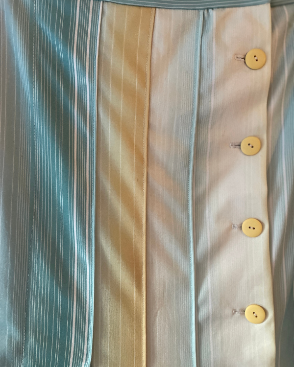 Corte recto con hilera de botones en un costado donde se aperturan unas tablas, mismas que le dan mayor amplitud.