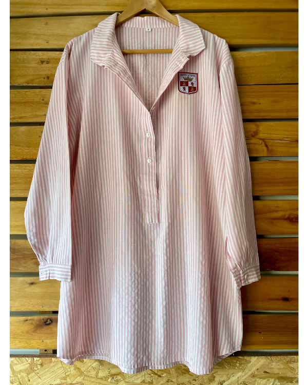 Manga larga, con cuello pequeño e hilera de botones.