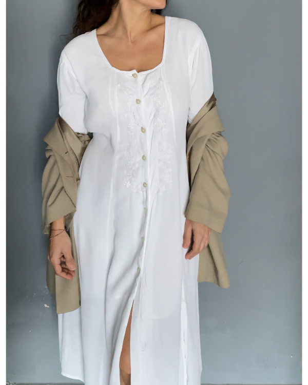 En el pecho está bordado, detrás presenta tira para regular la cintura.